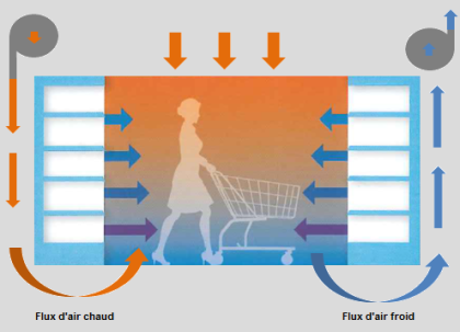 MCI a mis au point et breveté un système de gestion globalisée de la ventilation permettant d'adapter le traitement des allées en fonction des besoins avec un souci constant d'optimisation énergétique. L'air froid retiré des parties basses des allées est remplacé par l'air chaud stagnant en partie haute, générant ainsi des remontées significatives de température dans les allées sans impact sur la performance des meubles frigorifiques.